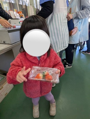 ちぎったいちごを測ってもらい、一人ひとり容器にラップをかけてもらうとにっこり!嬉しそうな子どもたちでした♪